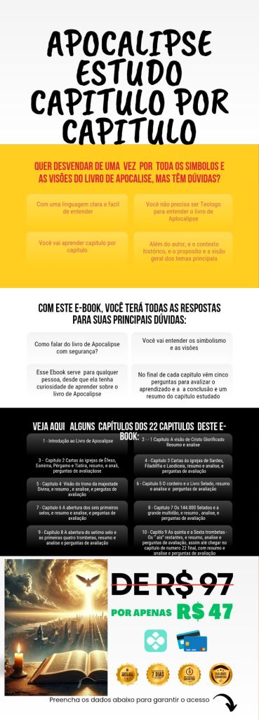 Você está pronto para mergulhar em uma das obras mais intrigantes e enigmáticas da Bíblia? No nosso e-book “Estudo do Apocalipse: Capítulo por Capítulo”, você encontrará uma análise detalhada de cada versículo, revelando significados profundos e aplicações práticas para a sua vida.